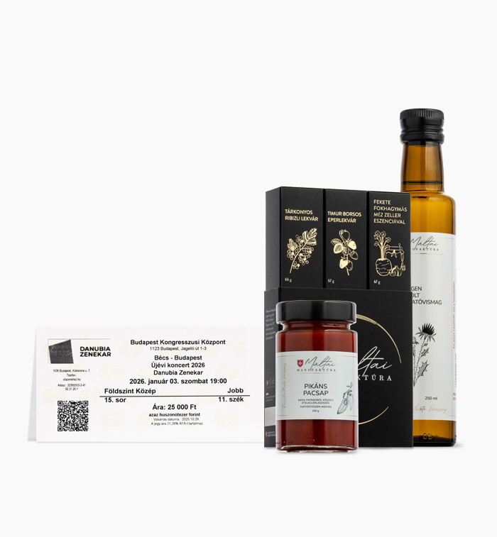 Ajándék testnek és léleknek! Az olajból, pikáns pacsapból, a speciális ízesítésű lekvárokból és mézből készült összeállítás a különleges ízlésűeket szólíthatja meg, akárcsak mellettük a párosjegy, mely az elegáns, osztrák-magyar békeidők hangulatát idéző Bécs-Budapest újévi koncertre szól. Megvásárlásával a KÖZÖS HANG projektet támogatja, mely a Danubia és a Máltai Szimfónia Jelenlét díjas programja a felzárkózó településeken zenét tanuló gyerekek művészi integrációjáért.